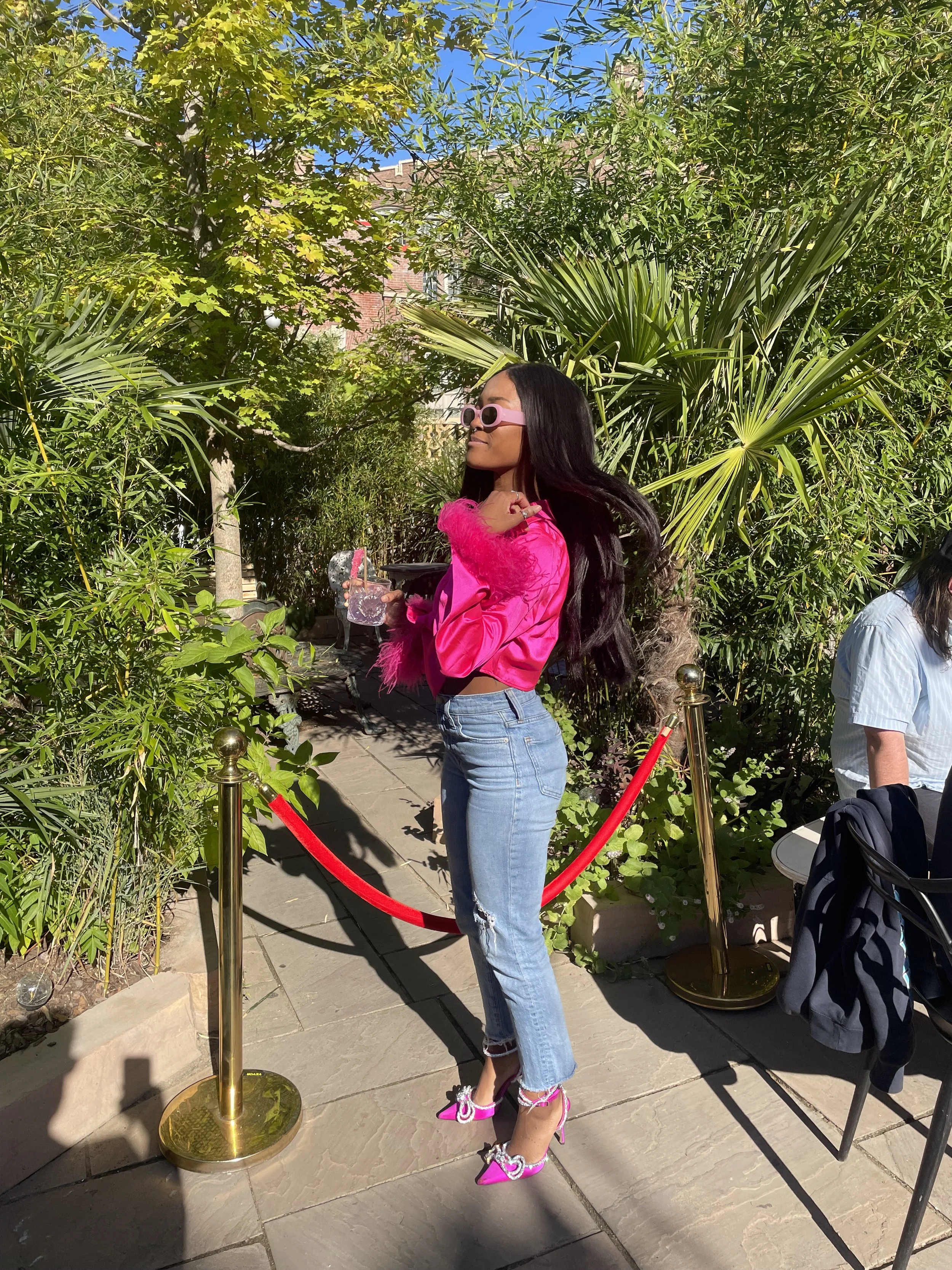 Sometimes the best way to feel like that girl is to wear a bold color. This hot pink blouse with feathered sleeves paired with jeans is already a statement, but finishing it off with matching pink heels made me feel unstoppable. It’s fun, loud in the best way, and perfect for brunch or nights out.