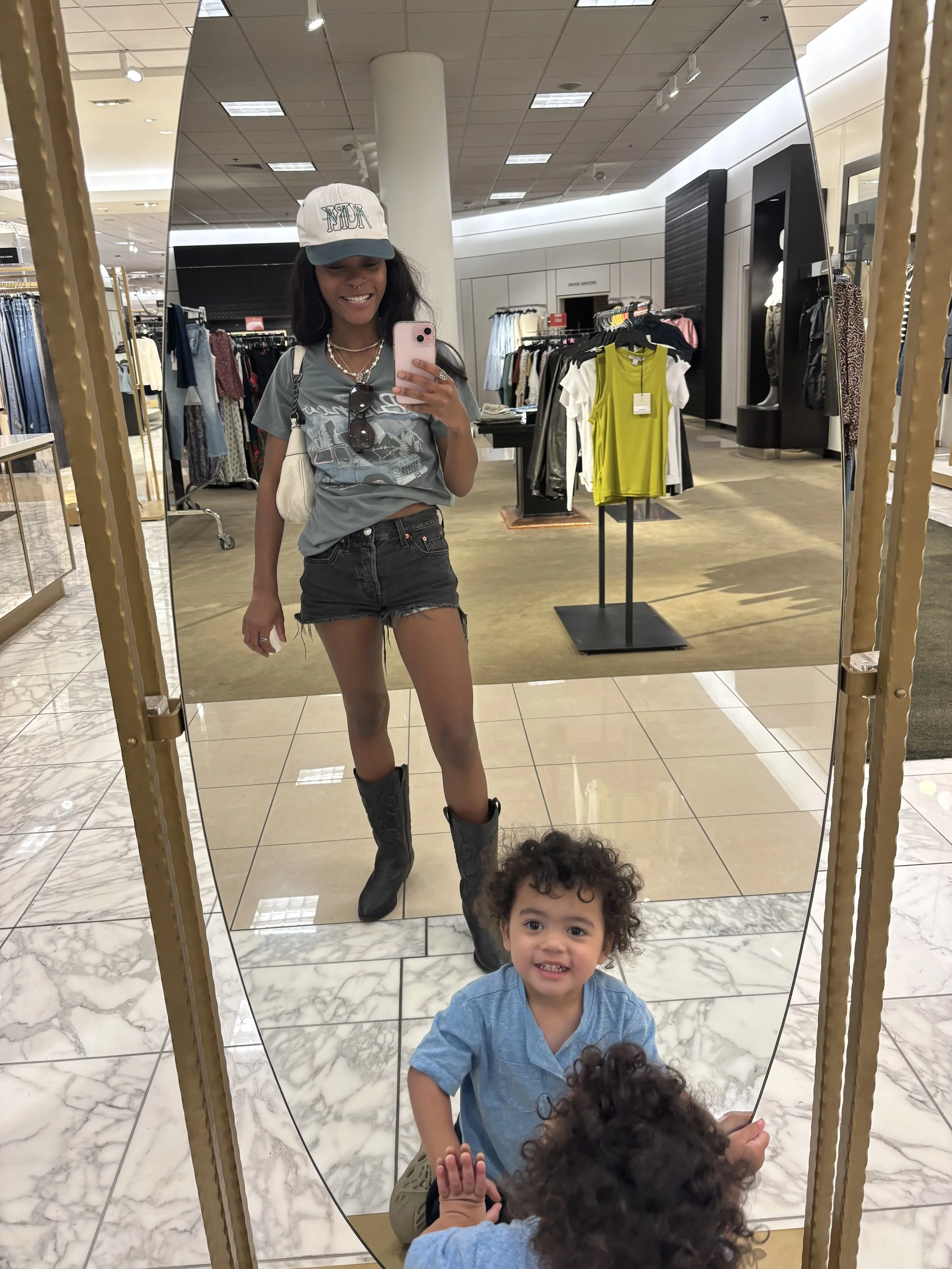 This look is one of my favorites because it’s casual, easy, and still so me. A simple graphic tee tucked into cutoff shorts keeps it relaxed, while the cowboy boots give it attitude and a little edge. I layered on some jewelry — including my “S” monogram necklace — and finished it off with my white juicy bag for a touch of vintage y2k. It’s the perfect balance: effortless, cool, and stylish enough to wear shopping, hanging out with the kids, or even grabbing lunch with friends.